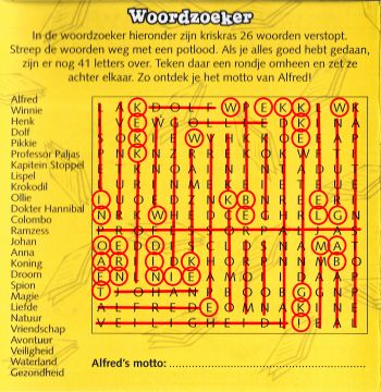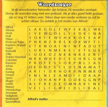 In de woordzoeker hieronder zijn kriskras 26 woorden verstopt. Streep de woorden weg met een potlood. Als je alles goed hebt gedaan, zijn er nog 41 letters over. Teken daar een rondje omheen en zet ze achter elkaar. Zo ontdek je het motto van Alfred!