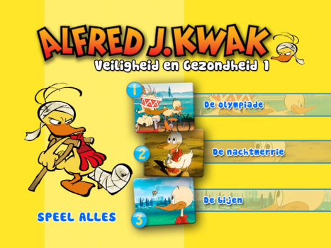 Alfred J. kwak - Veiligheid & gezondheid 1 (lit: Alfred J. Kwak - Safety & health 1) is a DVD that was released in 9 September 2006 as part of the first wave of DVDs of the Alfred J. Kwak - Jouw vriend voor het leven series. It contains episodes 6, 20 and 21 of the animated series. The DVD features no subtitles, no alternative audio tracks and no special features. It was also sold together in the 3 DVD collection set De Collectie - 3 DVD BOX and Veiligheid & gezondheid - 3 DVD BOX.