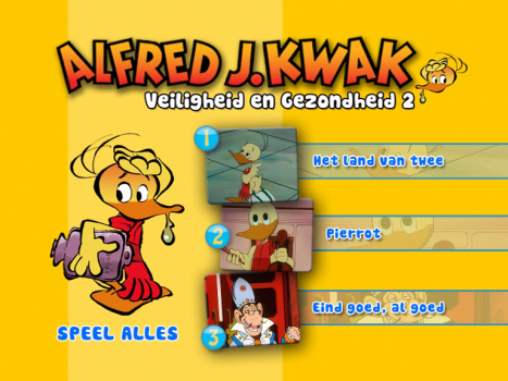 Alfred J. kwak - Veiligheid & gezondheid 2 (lit: Alfred J. Kwak - Safety & health 2) is a DVD that was released in 2 May 2007 as part of the second wave of DVDs of the Alfred J. Kwak - Jouw vriend voor het leven series. It contains episodes 45, 46 and 47 of the animated series. The DVD features no subtitles, no alternative audio tracks and no special features. It was also sold together in the 3 DVD collection set Veiligheid & gezondheid - 3 DVD BOX.